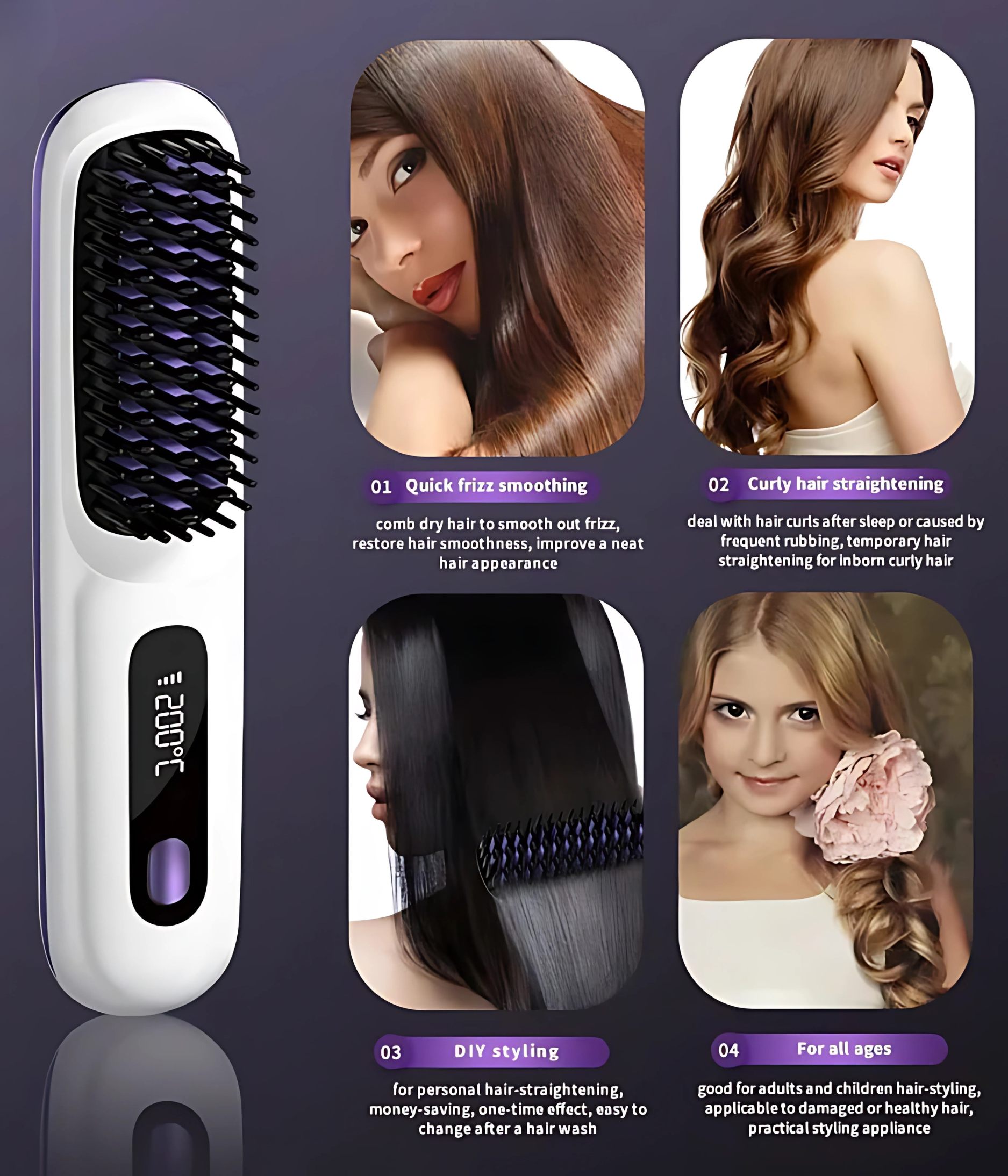 “Maak je haar glad en style het met de zachte keramische warmte van onze kam, perfect voor pluizig of delicaat haar.”